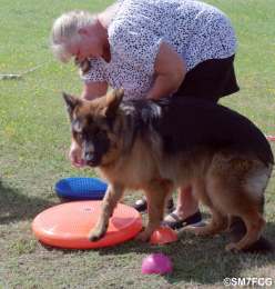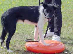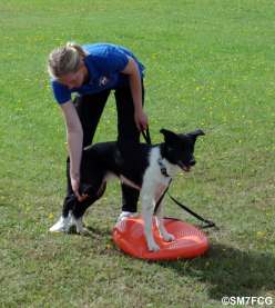 Den röda mjuka kudden passar bra till att träna hundens frambensbalans. |