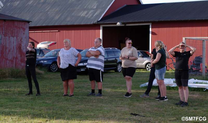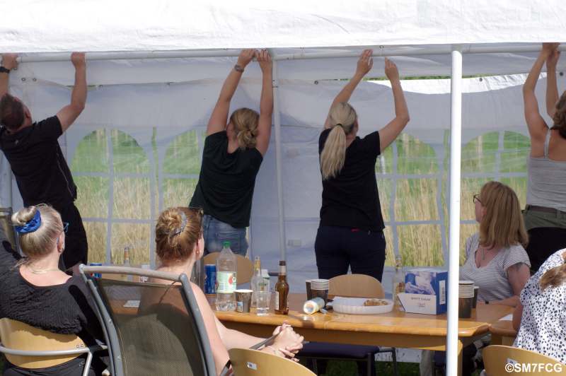 Kvällsbrisen kom och försökte lägga beslag på partytältet, men med gemensamma ansträngningar blev det förankrat. |